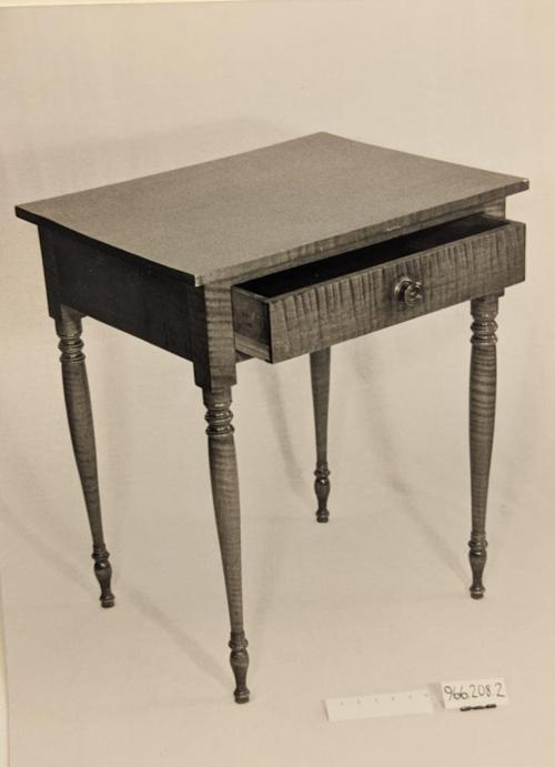 DescriptionSmall tiger maple table, one drawer, glass knob on drawer, legs turned and tapered.