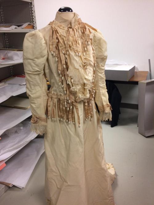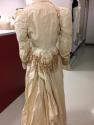 DescriptionIvory cotton & satin wedding dress, Bodice- high collar with lace trim, puffed sleeves with chiffon cuff, satin pouch in front, trimmed with ribbons & bobbles, fitted & boned bodice trimmed with ribbons & bobbles on lower edge. Skirt- gathered at back for bustle, pocket at back, train with ruching along hem. Orange blossom- wax flower decoration (probably went on veil)