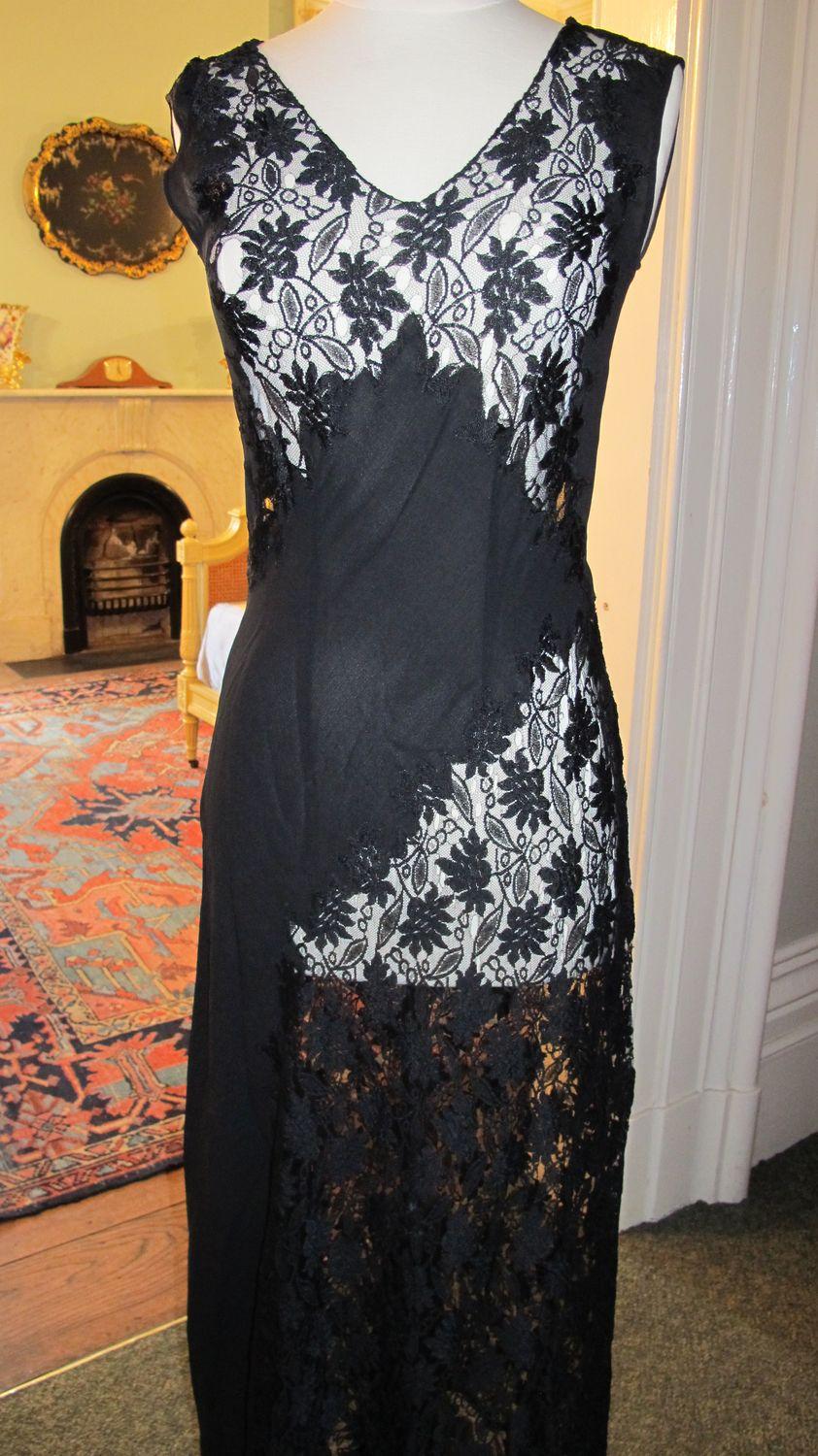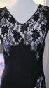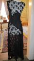DescriptionLong crepe & lace dress, round neckline at front, V neck at back, lace yoke front & back, sleeveless, no waistline, skirt in an asymmetric lace design beginning at one hip to hem making up 2/3's of the skirt, flared at hem.