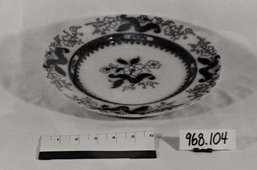 DescriptionFlow blue plate; design of 4 sprays of leaves in blue with finely traced flowers on border, central design same style. Impressed mark on back indicates maker was Thomas Dimmock & co. 1828-59