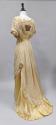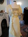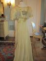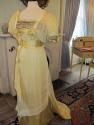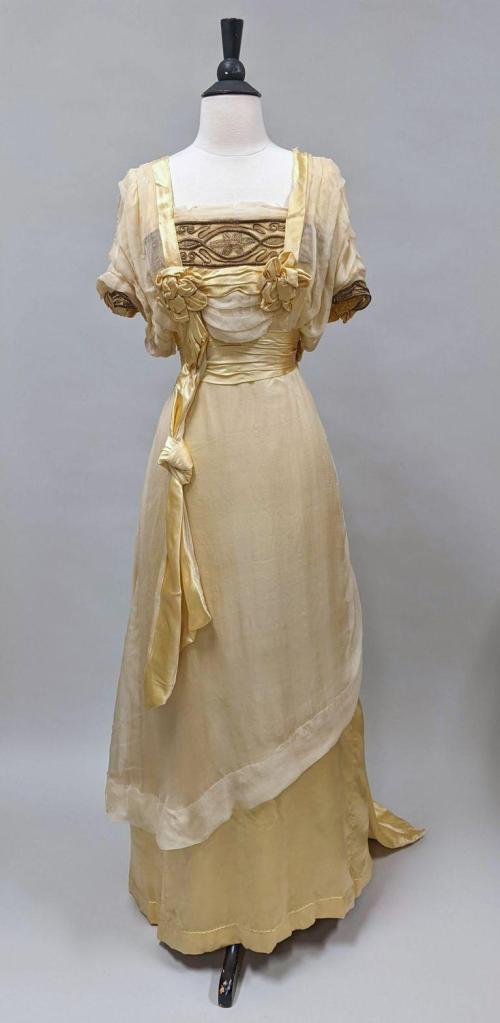 DescriptionDress with yellow silk-satin & chiffon long dress, boned square neck, insert of gold braid and netting, two satin rosettes below braiding, satin tucked cumberbund, tucked chiffon on bodice and sleeves trimmed in satin, short sleeves trimmed in gold braid and satin rosette, back hook and eye closure, side hook and eye closure trimmed in chiffon ruching ending in rosette, cotton underskirt with pleated chiffon hem, train.