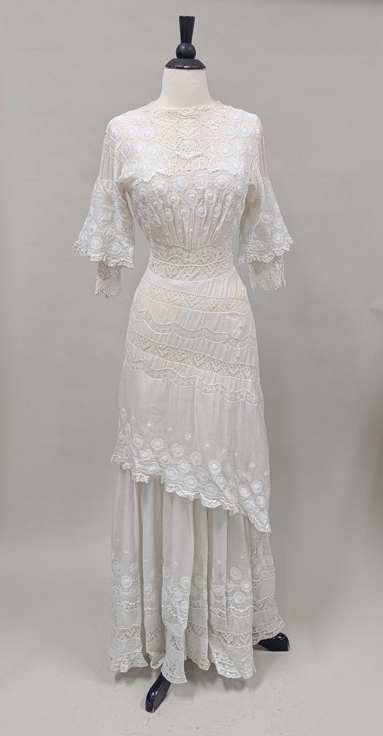 DescriptionWhite embroidered muslin dress, lace insertion, high round neckline, fitted waist, sleeve cut in one piece with bodice, has attached undersleeve, back button closure, overdress ends at hip, underskirt continues to floor, net lining attaches underskirt to waist.