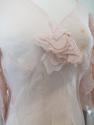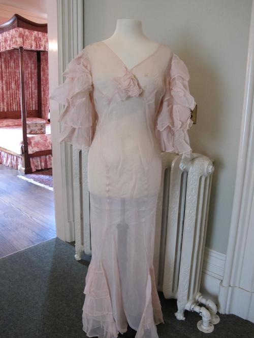 DescriptionPink organdy, V neck, panelled, panels made up of inverted V's, three flounces at each side, sleeves puffed with four flounces, flower or organdy at front.