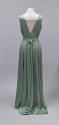 DescriptionLadies full length green satin dress, sleeveless, square neck, gathered at shoulders for full bust, tucked inserted below bustline, back pleated at waist, back neckline in a V, flared skirt, belt.