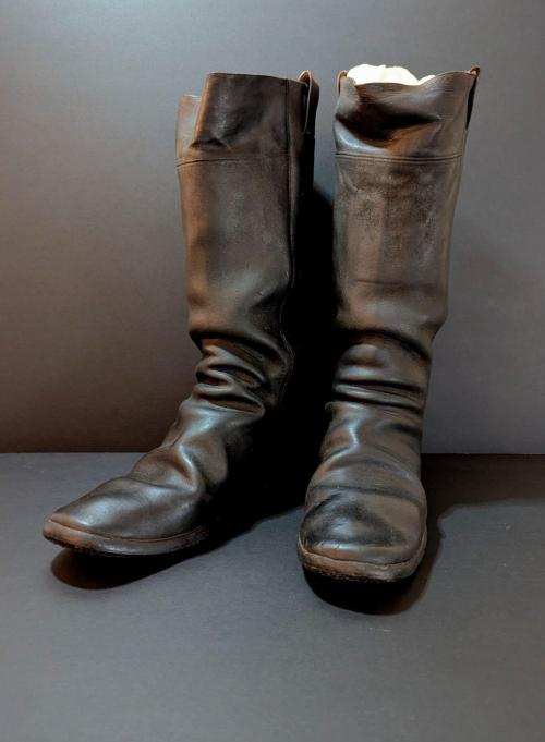 DescriptionTall "pull-on" heavy black leather work books, square toes, large heel, thick sole attached by numerous nails, side loops for pulling on, band at top front, front top lined in finer leather.