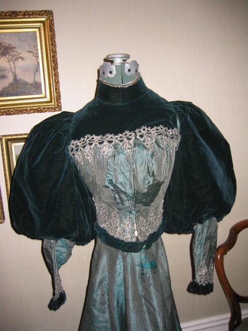 DescriptionTwo piece dark green velvet and plaid taffeta dress with silver beaded braiding, fully boned, high neckline, gored skirt, leg-o-mutton sleeves all lined with light brown cotton.