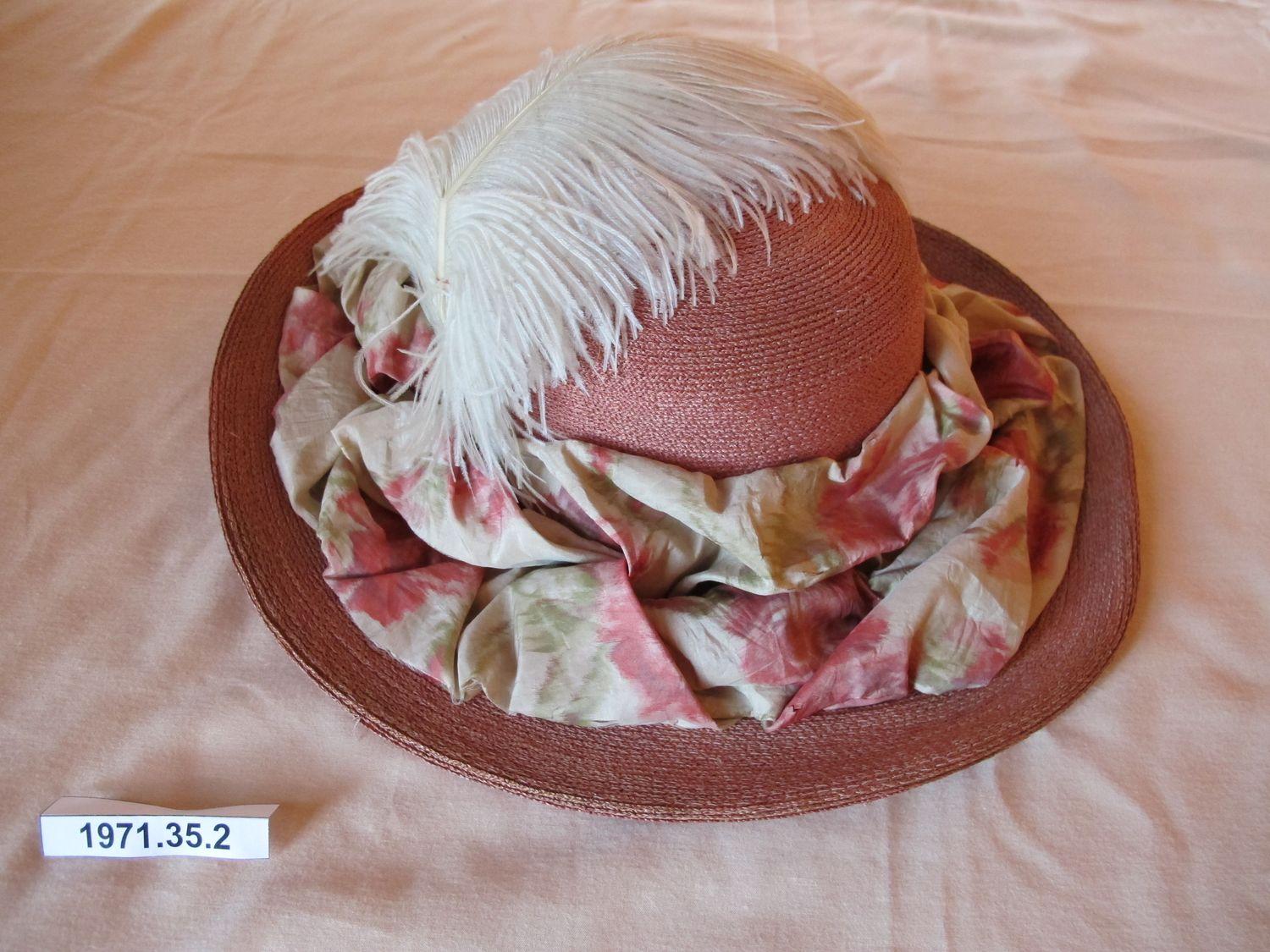 DescriptionLadies pink straw hat with rose, green and cream print gathered around crown, white ostrich plume draped over crown.