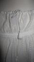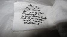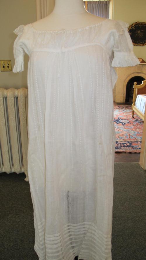 DescriptionWhite muslin with narrow panels of drawn work, 3" bodice with drawstring neck, short gathered sleeve with ruffle and band, lace epaulette probably added later, bodice partly lined with linen, skirt has 10 tucks at lower edge, entirely handmade.