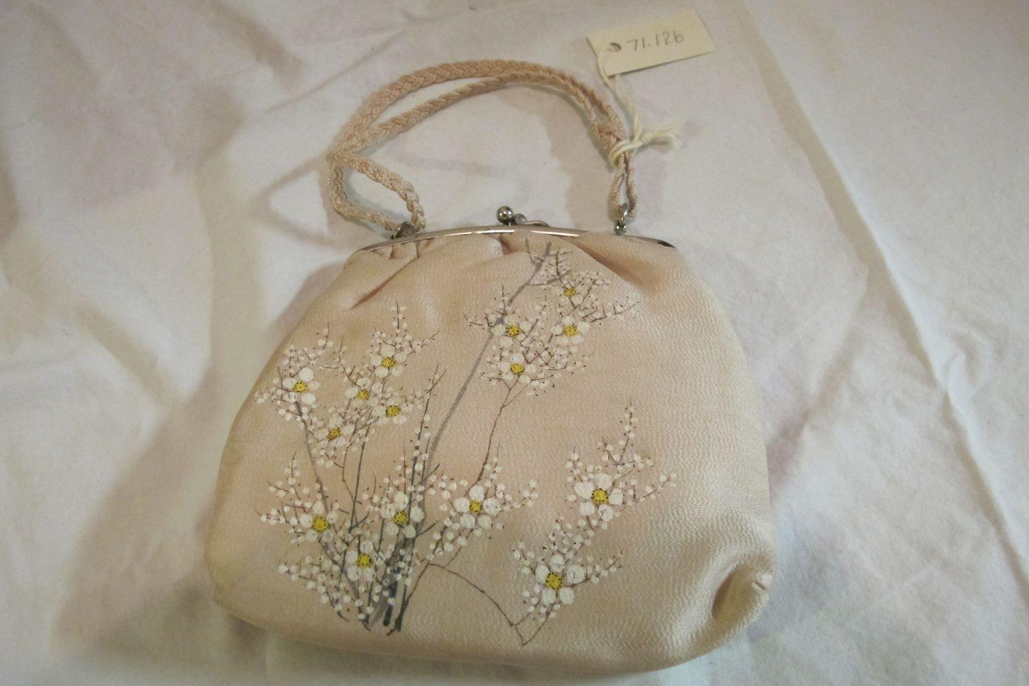 DescriptionSmall pink silk purse with hand painted floral design, thin silver metal frame & 2 ball clasp, pink braid, cord handle, lined with pink silk, 1 inside pocket.