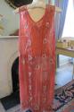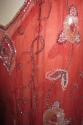 Red chiffon beaded dress, V-neck, sleeveless, slit up sides, floral and line bead design.