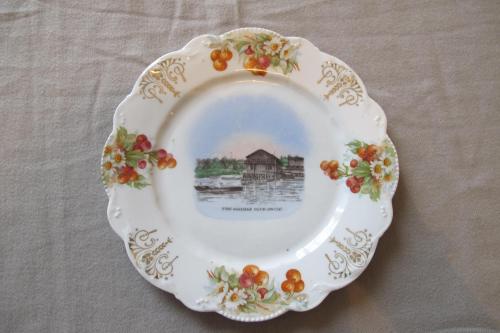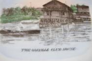 Small plate with painting of Oakville Club House in centre, earthenware.