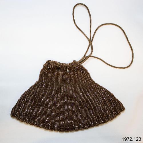 Amber coloured beaded purse; unlined; larger at bottom than opening; drawstring closing; cord handle.