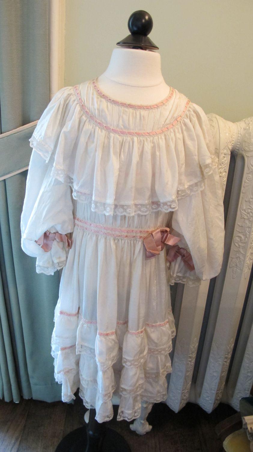 DescriptionChild's white silk dress, fitted bodice, fullness gathered into rows of pink ribbon and lace trim, large ruffle around yoke, full gathered puff sleeve with full cuff at elbow, tighter inner sleeve of stiff fabric, full skirt with bands of 3 ruffles with lace and ribbon, only bodice lined, 5 button back closure.