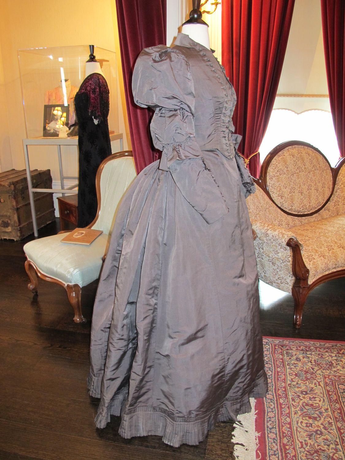 DescriptionGrey silk faille; bodice: has front closure, small peter pan collar, sleeves (leg o'mutton sleeves); skirt: accordian pleated frill at hemline, hook and eye closure at back, large number of gathers at back.