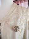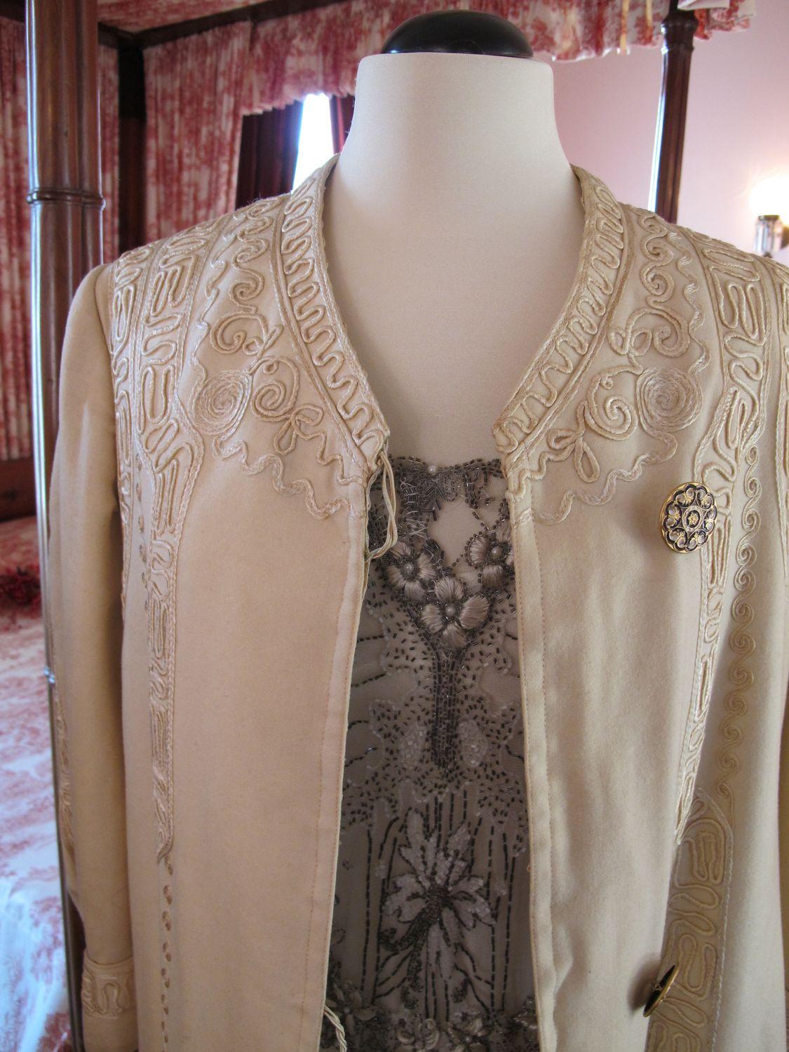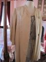 DescriptionOff white wool opera coat, V-neck, 3 front button closure; enamelled buttons with organic design; braiding down front, back around shoulders and neck, down arm in curvilinear motif; full length, wide sleeves come to wide braided cuff.