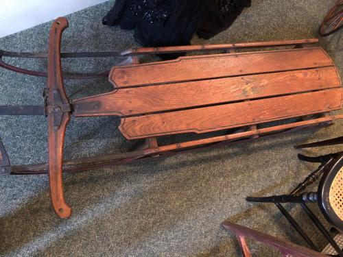 DescriptionLarge wooden child's sled with metal runners, painted red.