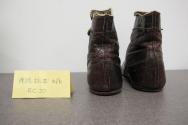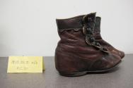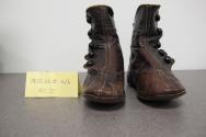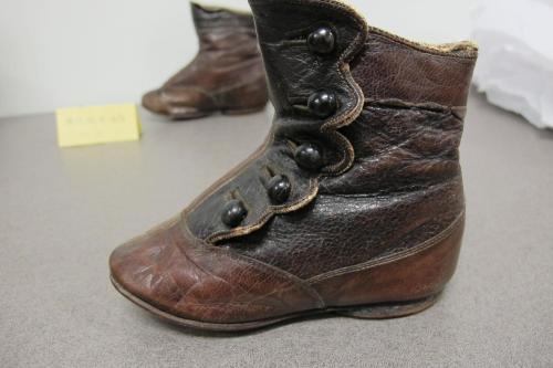 Young child's leather shoes with buttons sides, two-toned, black-brown, buttoned sides with scalloped edge.