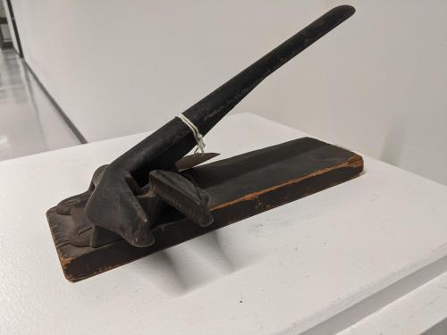 Nutcracker, cast iron, on wooden base, works by means of a spring.
