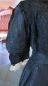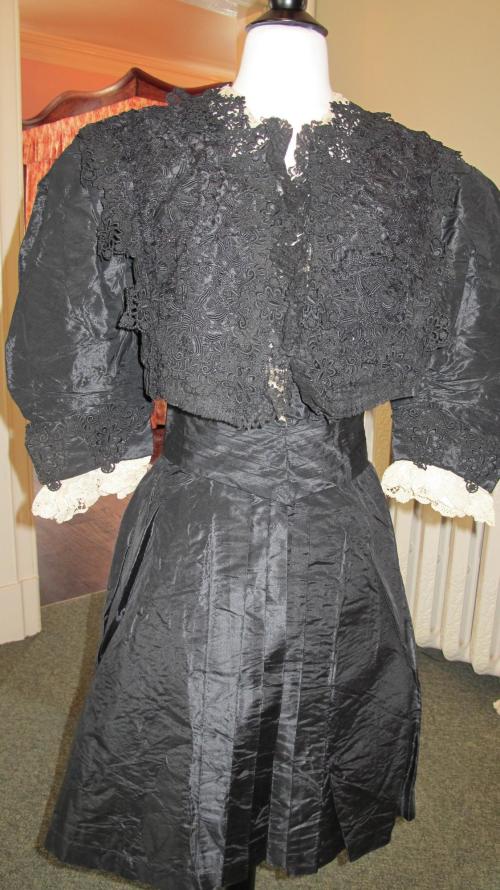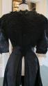 DescriptionLadies jacket, black taffeta with black lace on bodice and ecru lace trim at cuffs and neck, open front with cinched waist and long peplums (divided) at back, leg o' mutton sleeves, lined with ecru satin.