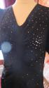 DescriptionBlack crepe long dress; V-neck, lengthwise strip of smocking down front of bodice; side hook & eye & snap closure; rhinestone design allover dress, some in starburst motif; flared skirt; puffy short sleeves.