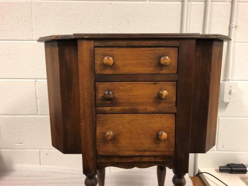 Small wood side table with 3 drawers and rounded edges.