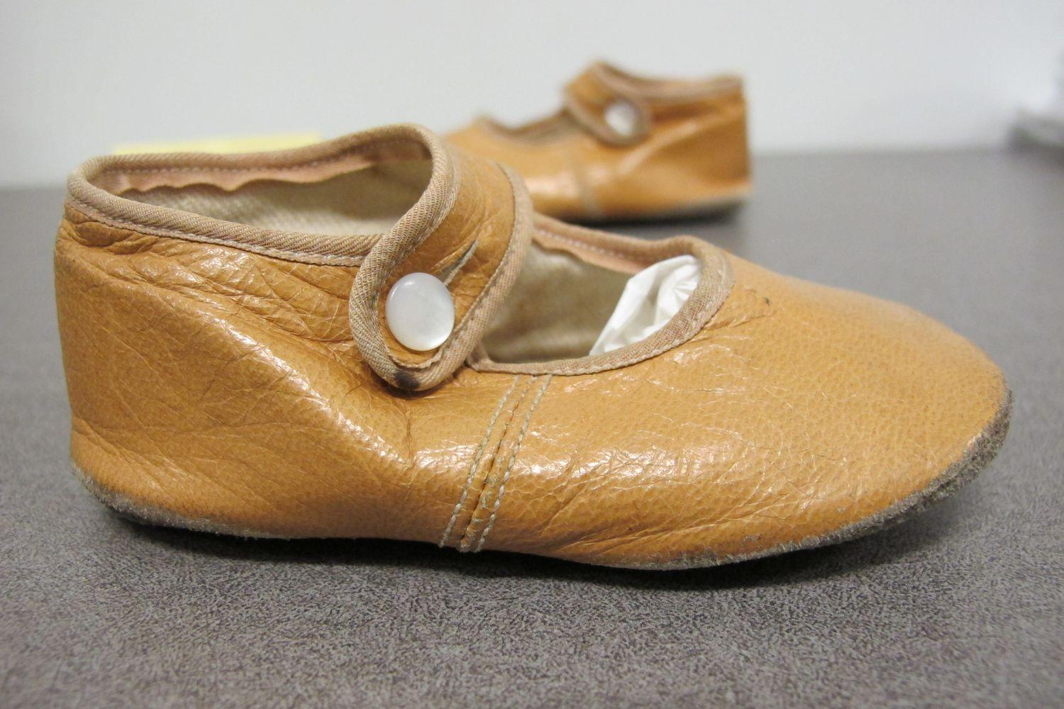 DescriptionBaby shoes, yellow leather, 1 button anklestrap, size 1.
