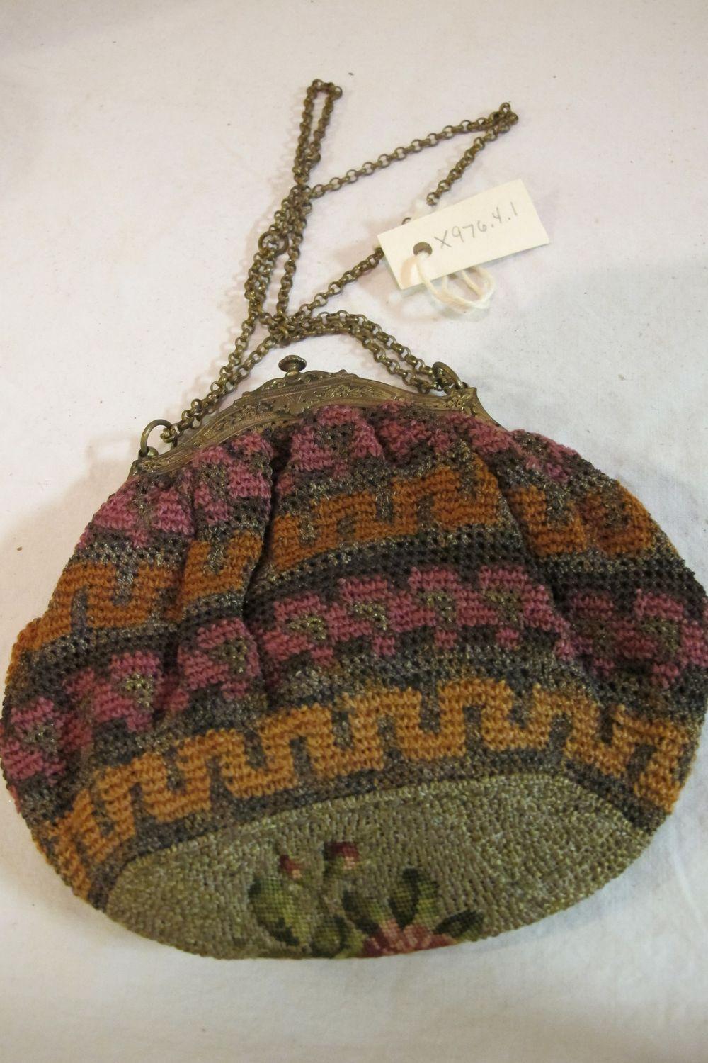DescriptionPouch shape needlework in orange purple and metallic bands of Greek key design, bottom pale green ground with pink petit point roses, gold frame with stamped design, gold chain handle, purple shot taffeta lining, 1 pocket.