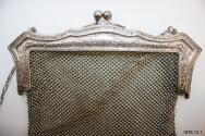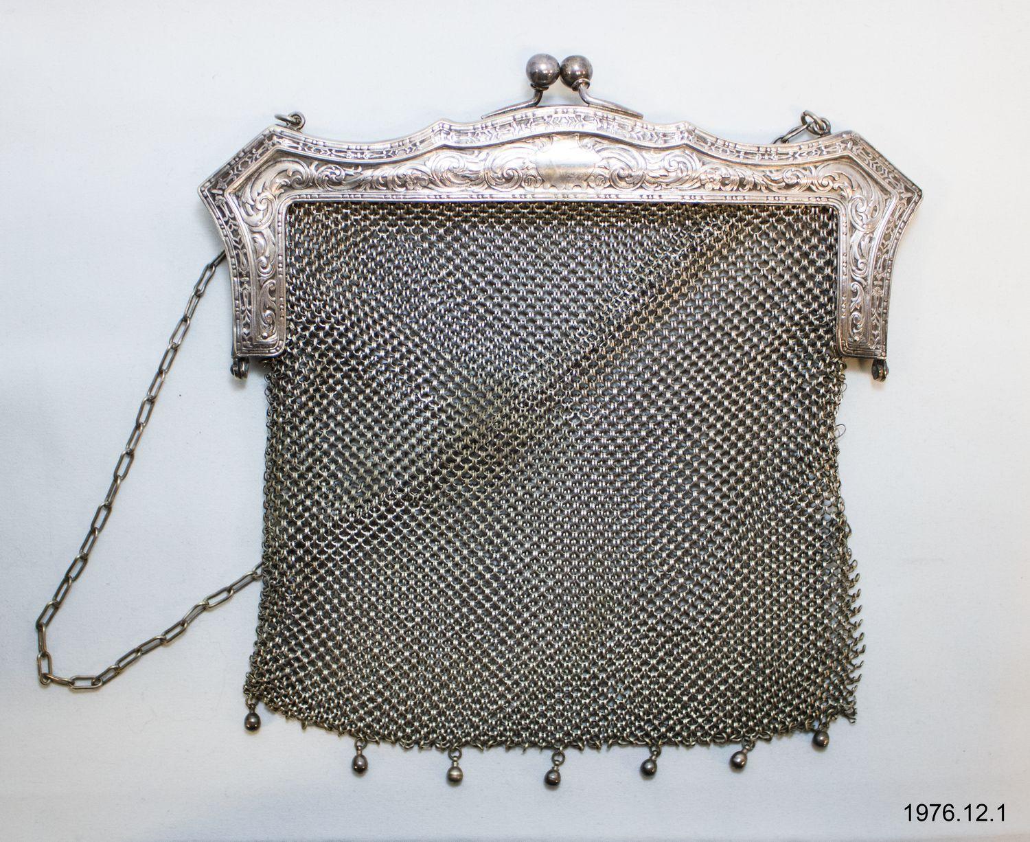 DescriptionCut steel mesh purse with silver engraved frame and clasp; 18" cut steel link carrying chain; bottom of mesh hung with small metal weights at 2" intervals.