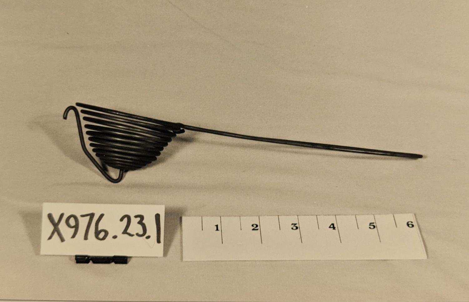 Coiled piece of heavy wire, handles at one end, at other, coils take on the form of a hive. Egg separator.