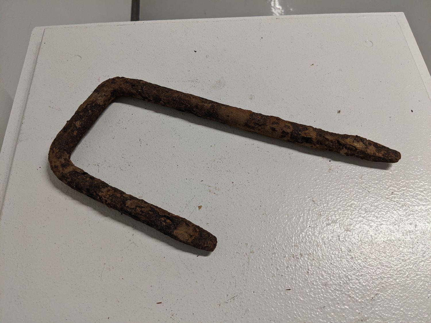 DescriptionExact identity unsure, could possibly be a staple used in building, iron U shaped bar, one arm longer that the other, appears to have been underground.