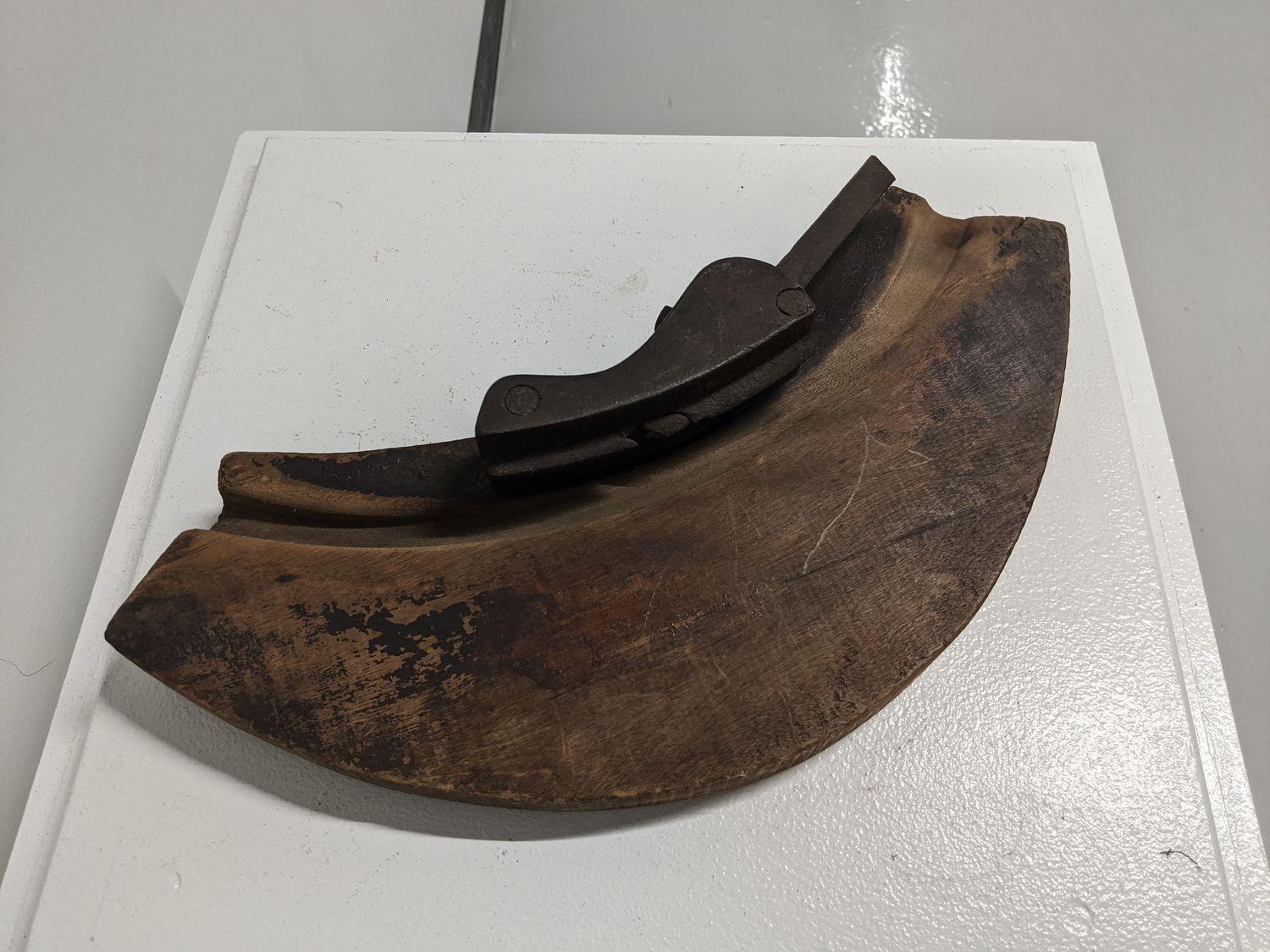 DescriptionA coopers tool used for making the chine around ends of barrels, wooden with cast iron fittings, crescent shaped with groove at outside.