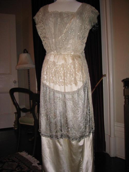 DescriptionWhite satin evening dress, short lace sleeves, square neckline, vast amount of trimming, trimming used to accentuate waist and bust, black and white lace covers white satin beadwork done on black lace, bones in bodice, hooks and eyes used to close back, completely hand sewn.