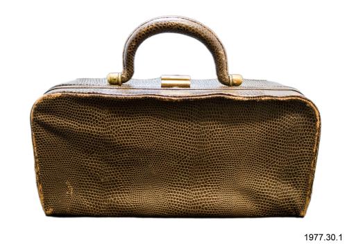 Description"Alligator" style purse, black leather with "gold" fittings, semi-circular handle with same covering, interior black taffeta lining, large pouch and change purse attached by cord.