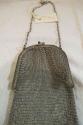 DescriptionCut steel mesh purse with silver frame, steel link carrying chain, clasp is entwined flowers with blue stones as highlight, pouch is trimmed at bottom with scalloped steel mesh.