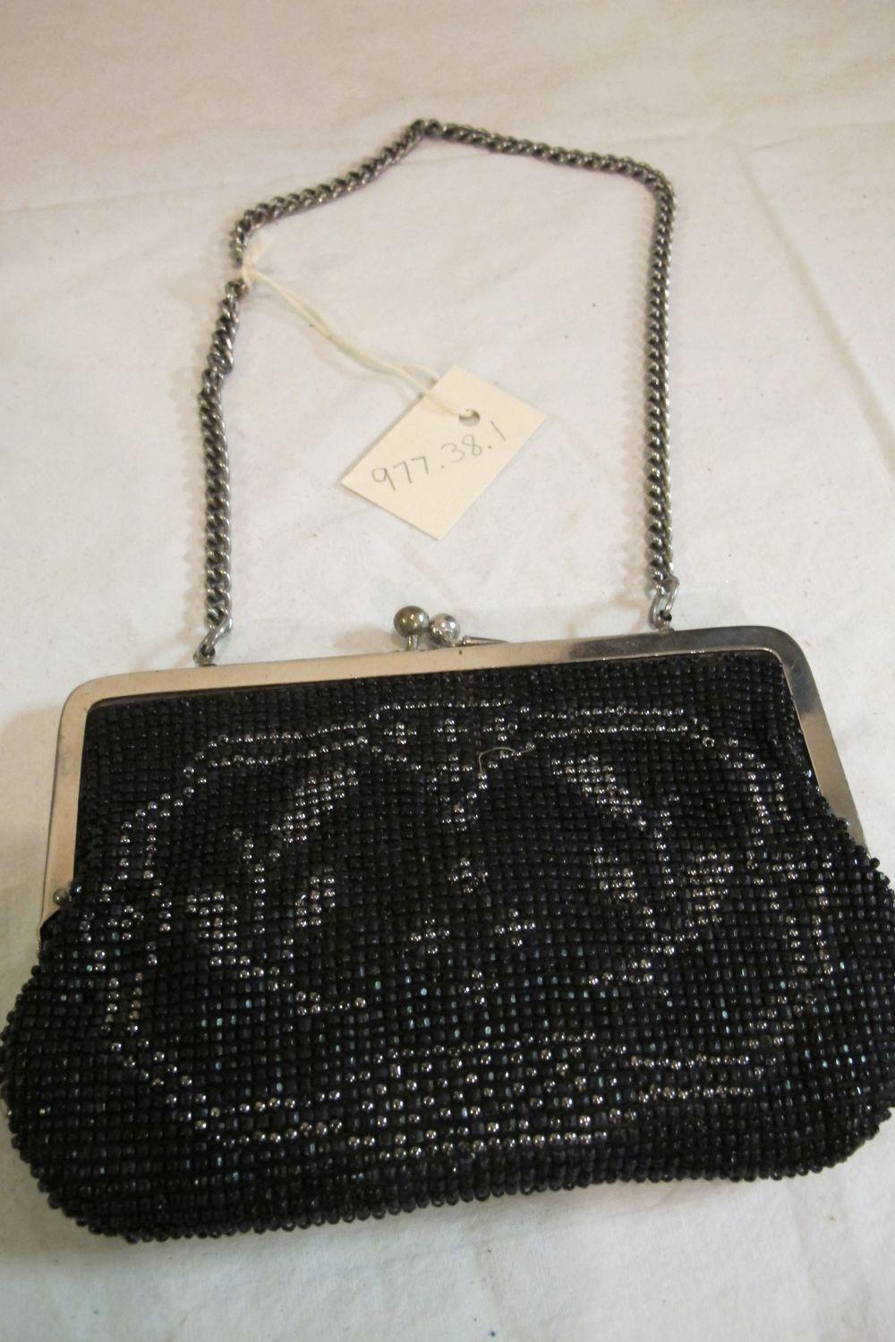 DescriptionRectangular bag, beaded with steel clasp and steel link carrying chain, beads, black flat bead background with round silver beads forming design, black cotton lining.