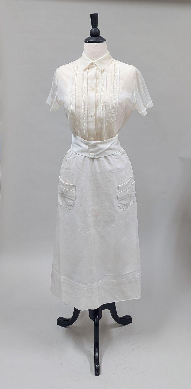 DescriptionWhite 3 panel skirt, 2 buttoned front pockets waistline gathered inner bias tape waistline hook and eye side closure 4 snap side closure, 2 button belt.
