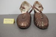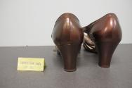 Descriptiona,b: Copper colour leather evening shoe, open strapwork toe, ankle strap with rhinestone buckle, heel.