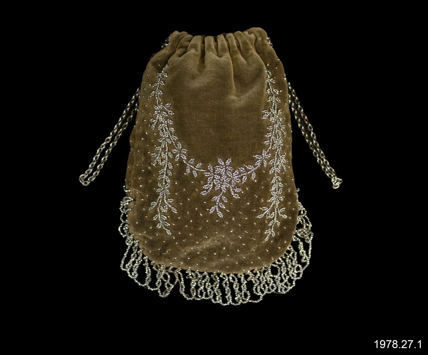 DescriptionGreen velvet & 'silver' beaded pouch-like purse; chain drawstring closure; fringe beading on bottom; silver design beading on purse.