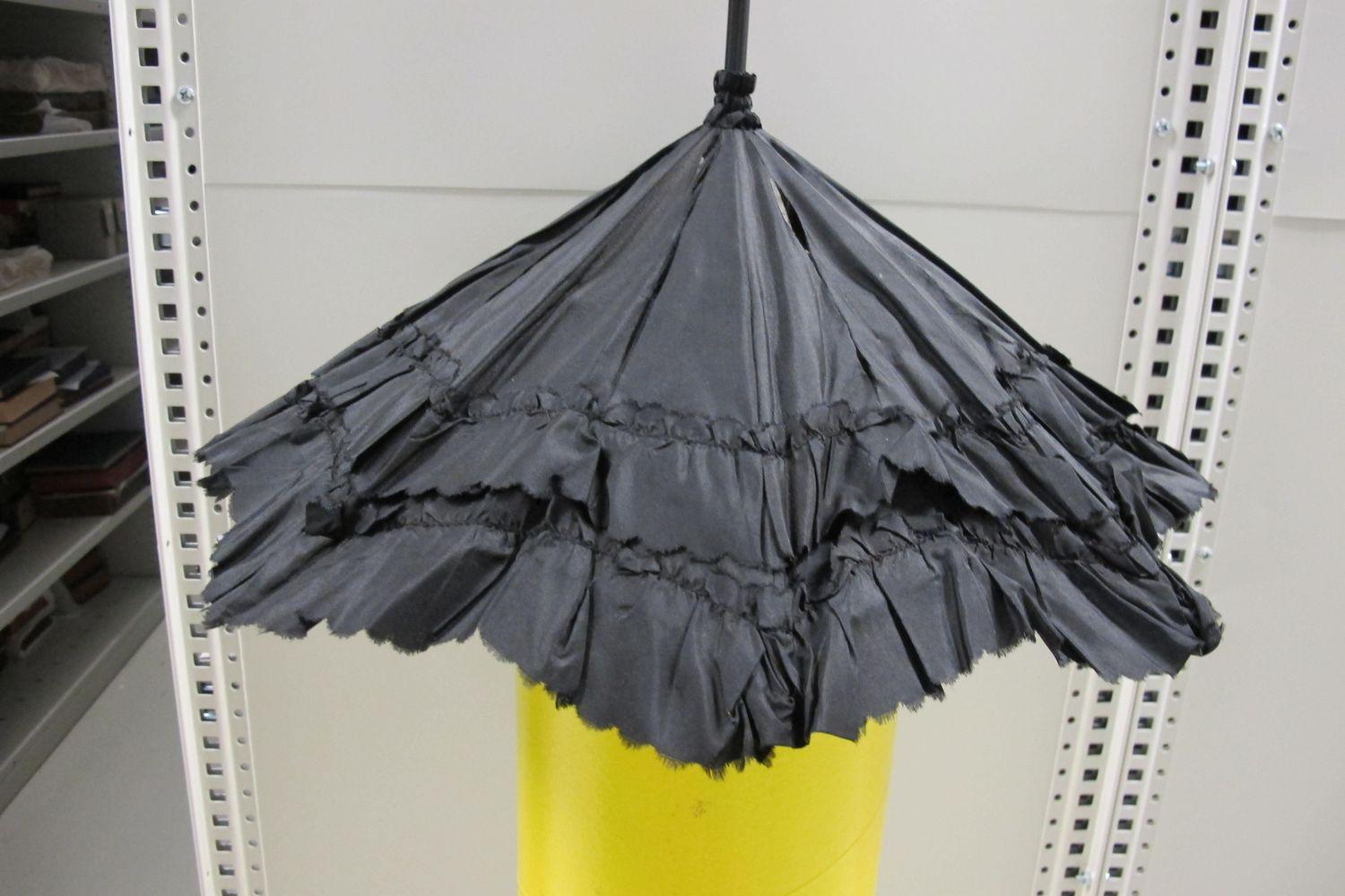 DescriptionBlack silk cover with 2 rows of ruffles, black silk lining, ruching encircling furrule, mounted on a black wooden collapsible stick, trimmed with black silk tassel, 8 rib frame.