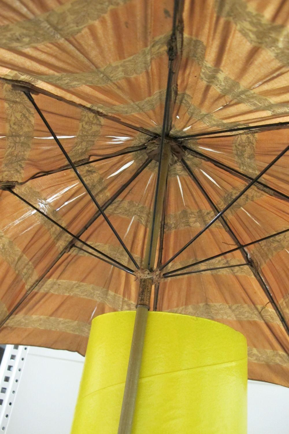 DescriptionPale brown cover, 5 woven inserts, mounted on a wooden stick with what appears to be machine carving in geometric design, 10 rib frame, rounded handle has leaf-carved motif, twisted cord with pom-pom is attached to stick.