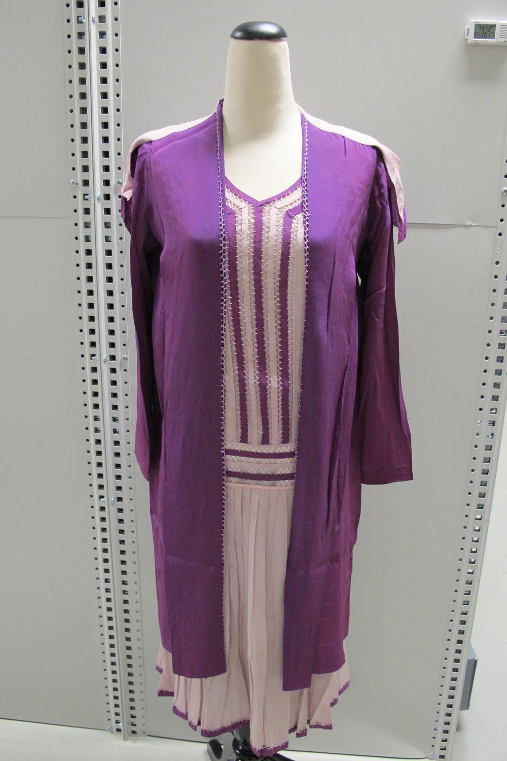 DescriptionDress, mauve & purple crepe de chine with 3/4 length coat.