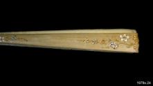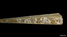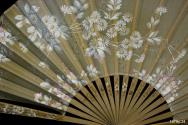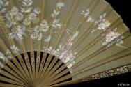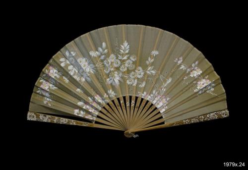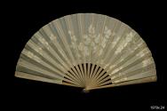 DescriptionFan with natural wood sticks and white gauze leaves; front of guards are heavily carved with flowers; petals of flowers are white enamel; flower and vine pattern on twelve center sticks, three white flowers in the middle; back of proper right guards also has flower pattern; white painted flowers with some pink accents on the leaves.
