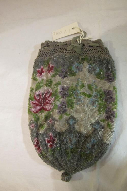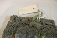 DescriptionOval shape beaded in shade of grey cream, rose, blue, mauve and green, pattern of roses and leaves on crean ground with grey at top and base gathered to beaded knob at base, grey crocheted band at top with green satin ribbons, lined with grey cotton.