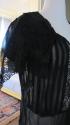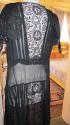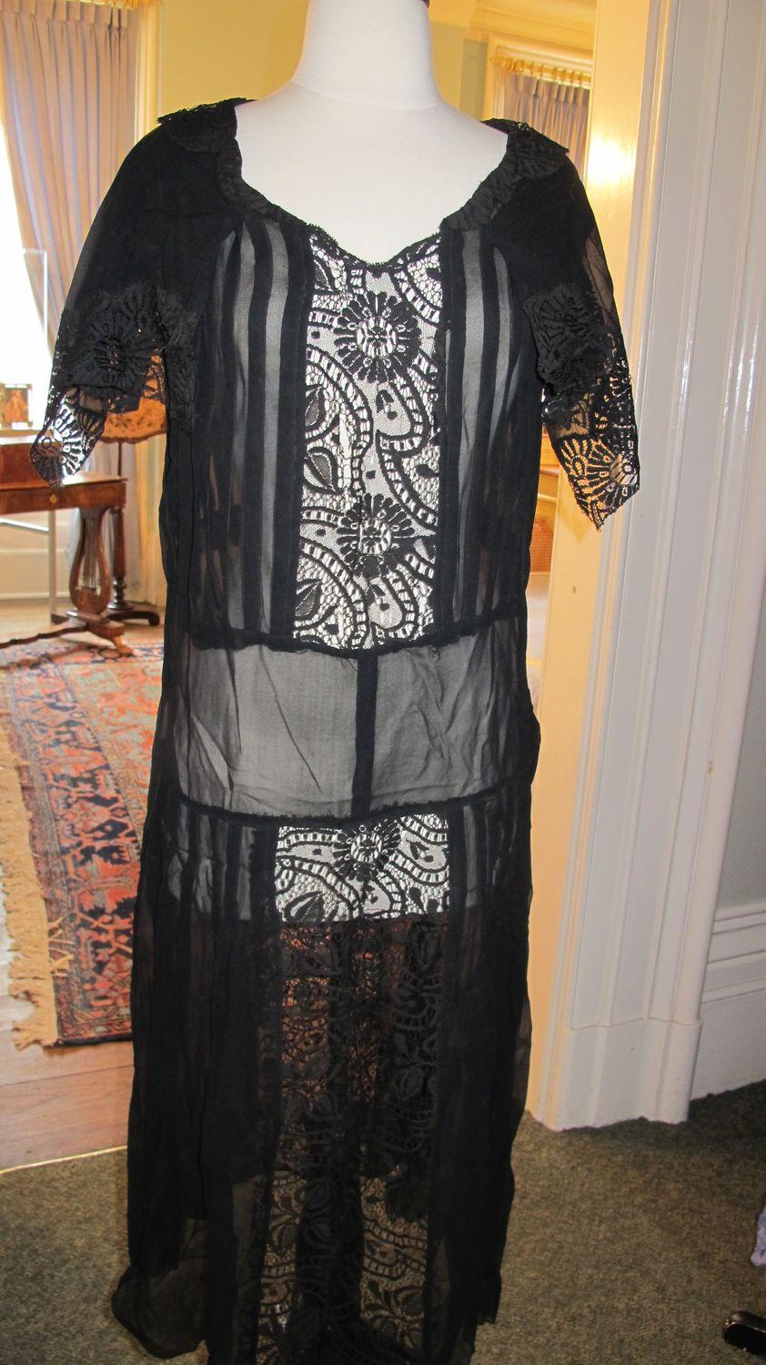 DescriptionBlack georgette with lace panels down front and back, v-neck, shoulder cape over set-in sleeves, lace edge, band around hips, skirt tucked below band, flaring to hem.