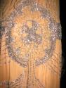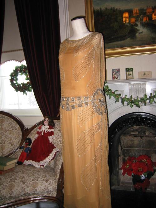 DescriptionEvening dress, sleeveless, ankle length, copper colour chiffon over lighter shade with steel beading; bodice open at sides to low waist with beading forming a bow design down each side; beaded pattern down sides of skirt; underslip of chiffon in lighter shade of copper.