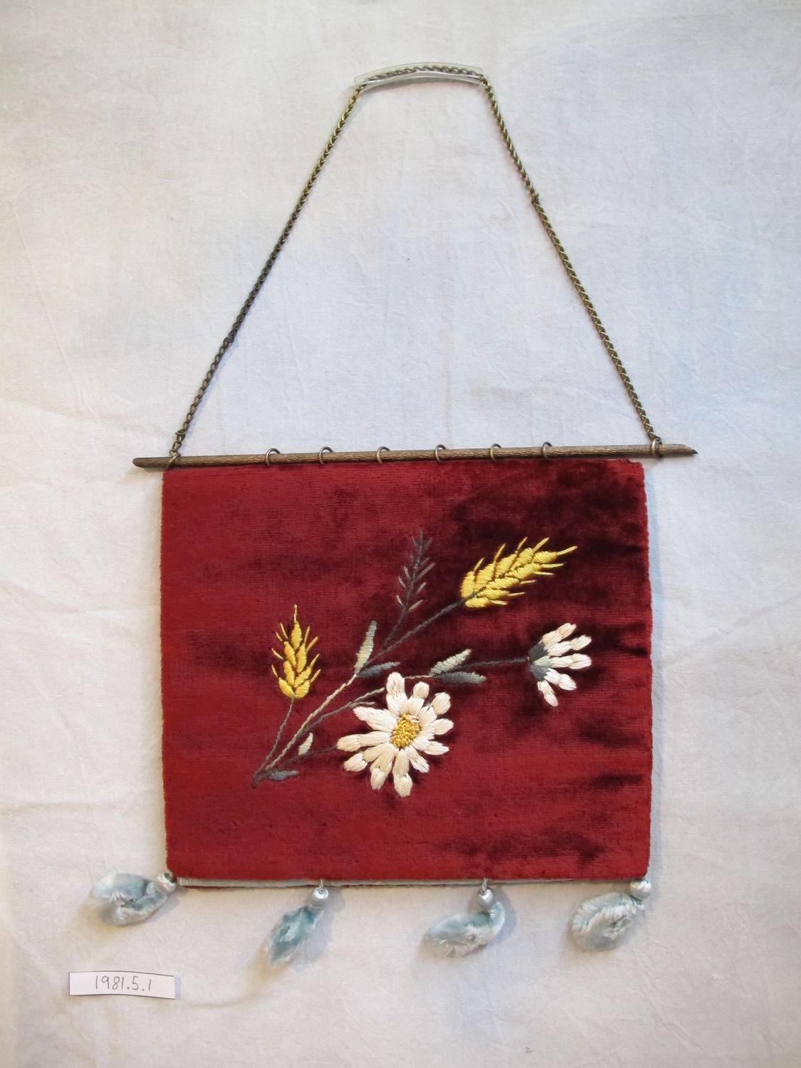 DescriptionBurgundy velvet tissue holder lined with light blue brocade satin trimmed with four light blue pompoms, hangs on metal rod with metal chain rope, holds white paper tissue used to wipe a razor.