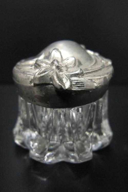 DescriptionSmall facetted clear glass jar with silver lid decorated with raised flowers.