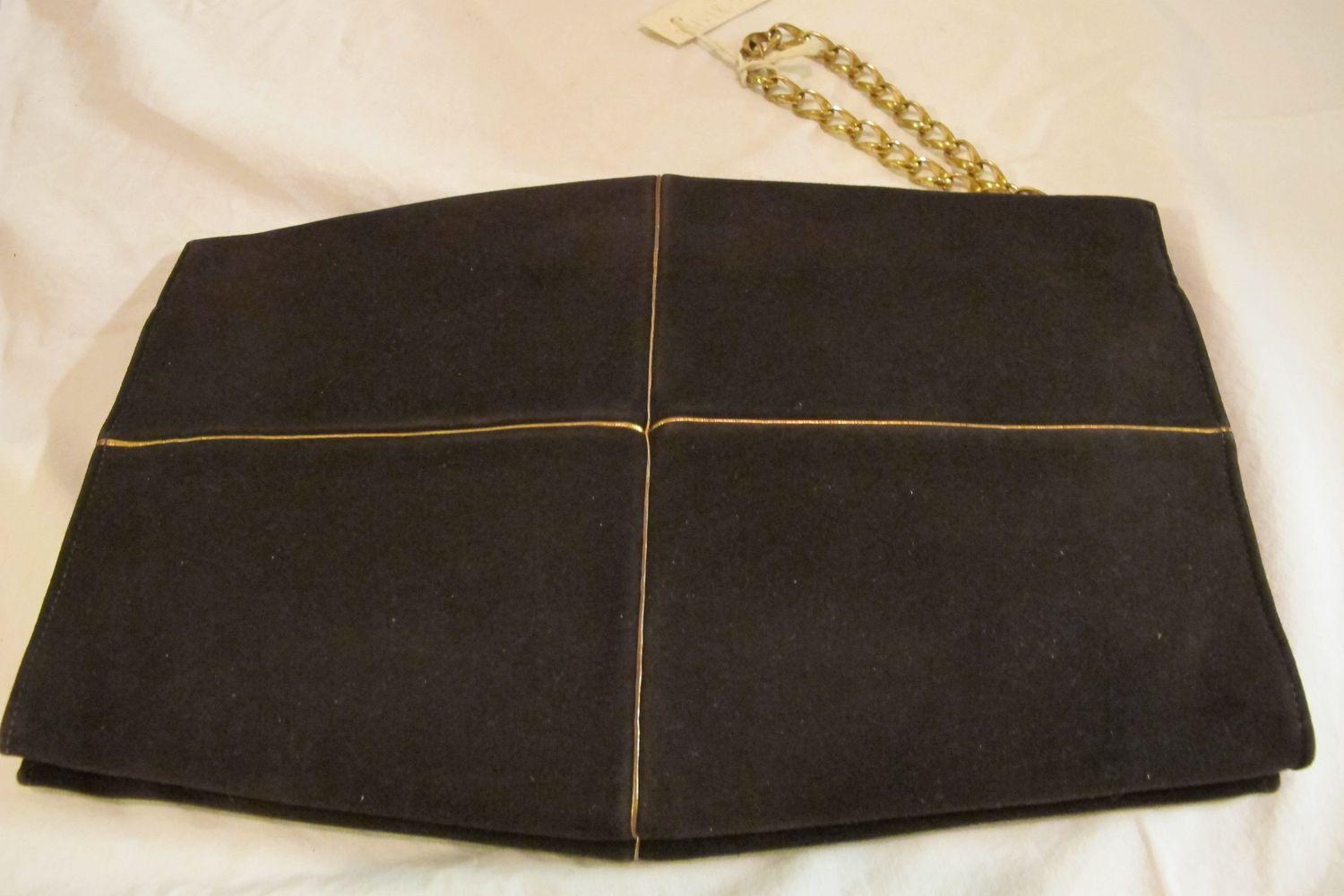 DescriptionBrown suede oblong purse, gold leather in single horizontal and vertical line across centre, zipper closing, gold metal chain handle, brown moire lining, change purse, zippered side pocket, mirror and comb inside.