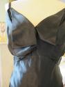 DescriptionBlack satin dress, bodice joined at V neck with turned back sections forming reveres, shoe string straps, back in deep V, wide satin band at waist giving effect of cummerbund, accordion pleated skirt flaring to picoted hem in 2 sections.