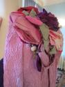 b: Jacket - collarless of mauve crinkled taffeta lined with purple crepe, raglan sleeves, flaring to hip, bunch of velvet & silk flowers on left shoulder of purple, wine, rose & mauve colours.